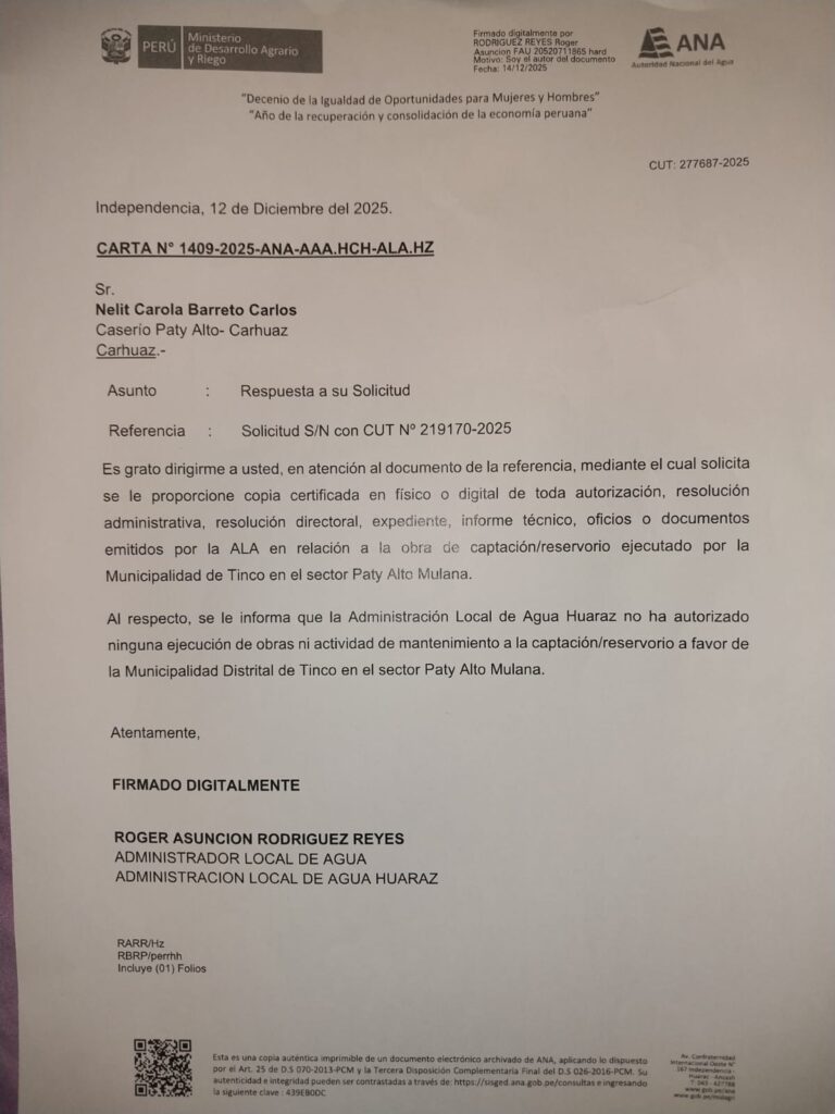 Según la Carta N.° 1409-2025-ANA-AAA.HCH-ALA.HZ, emitida el 12 de diciembre de 2025 por la Administración Local de Agua Huaraz, la ANA responde a una solicitud ciudadana precisando lo siguiente: