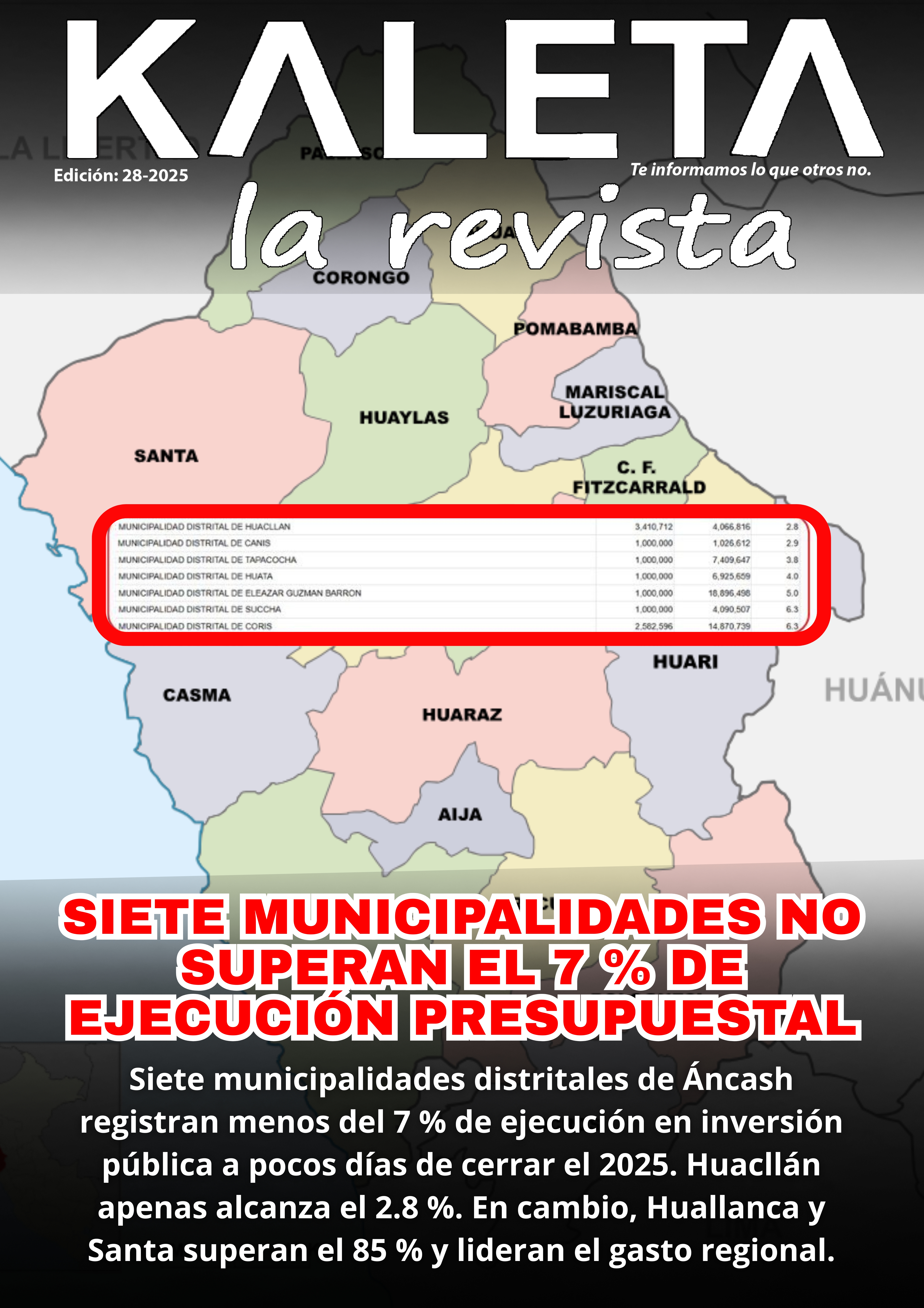 En el extremo opuesto, las municipalidades de Huallanca (90.8 %) y Santa (85.8 %) lideran la ejecución de gasto público en la región, con avances que superan ampliamente el promedio regional.