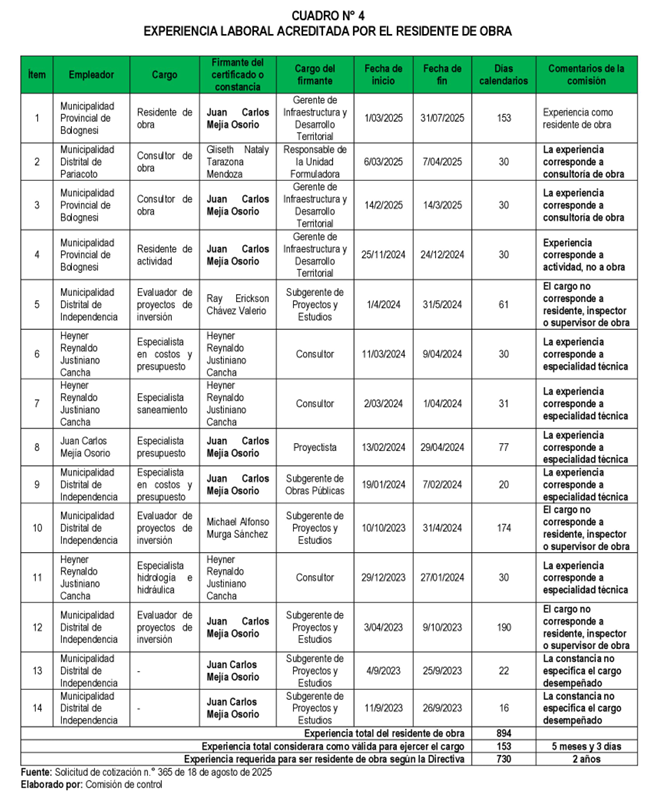 El informe revela que la Municipalidad redujo el requisito de experiencia de dos años a solo seis meses. Aun así, el profesional apenas acredita 153 días de experiencia válida. Es decir, ni siquiera cumple con el estándar recortado.