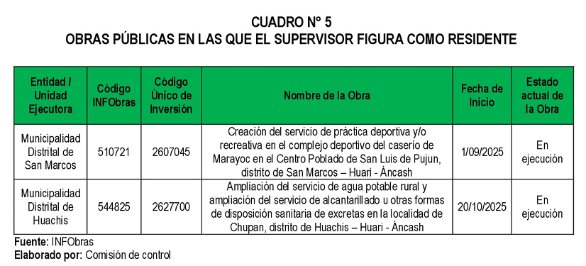 El caso más llamativo es el del supervisor de obra, Lucio Roberto Villanueva Fabián. Según registros oficiales del sistema INFObras, no solo supervisa el proyecto en Chiquián, sino que también figura simultáneamente en otras dos obras en San Marcos y Huachis, en la provincia de Huari.