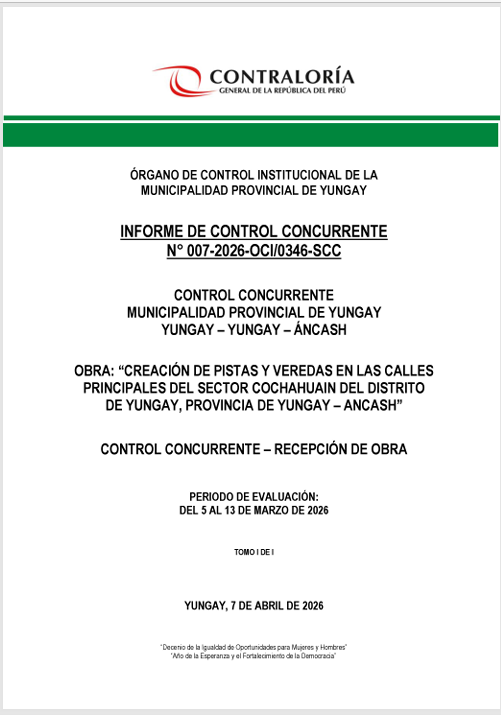 Según el Informe de Control Concurrente N.° 007-2026-OCI/0346-SCC, el comité de recepción de la comuna aprobó la obra el pasado 6 de marzo de 2026 sin observaciones, pese a que la comisión de control detectó múltiples fallas físicas y constructivas durante inspecciones realizadas entre el 5 y 13 de marzo.
