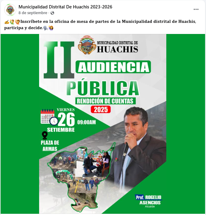 En la página oficial de Facebook de la municipalidad, solo se publicó un afiche anunciando el evento, sin evidencia audiovisual, sin cifras precisas y sin detalles verificables. ¿Por qué una audiencia pública, supuestamente participativa y abierta al pueblo, no fue difundida en tiempo real ni contó con información oficial completa desde el primer momento?