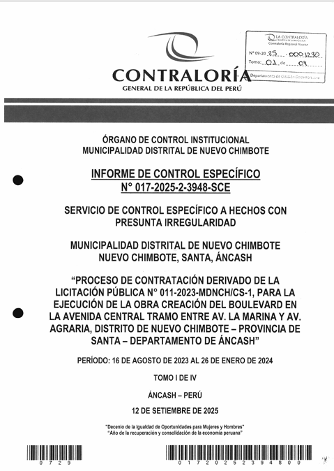 La Contraloría General de la República advirtió presuntas irregularidades en el proceso de licitación pública n.º 011-2023-MDNCH/CS-1, convocado por la Municipalidad Distrital de Nuevo Chimbote, en la actual gestión Walter Jesús Soto Campos para la ejecución de la obra “Creación del boulevard en la avenida Central, tramo entre Av. La Marina y Av. Agraria”, valorizada en más de S/ 18 millones.