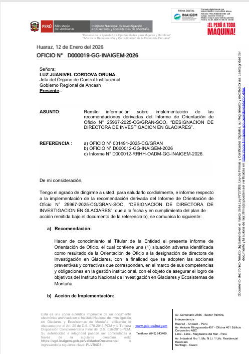 El órgano de control recomendó al titular del INAIGEM adoptar acciones preventivas y correctivas frente a la situación detectada y comunicar, en un plazo máximo de cinco días hábiles, las medidas tomadas al Órgano de Control Institucional del Gobierno Regional de Áncash.