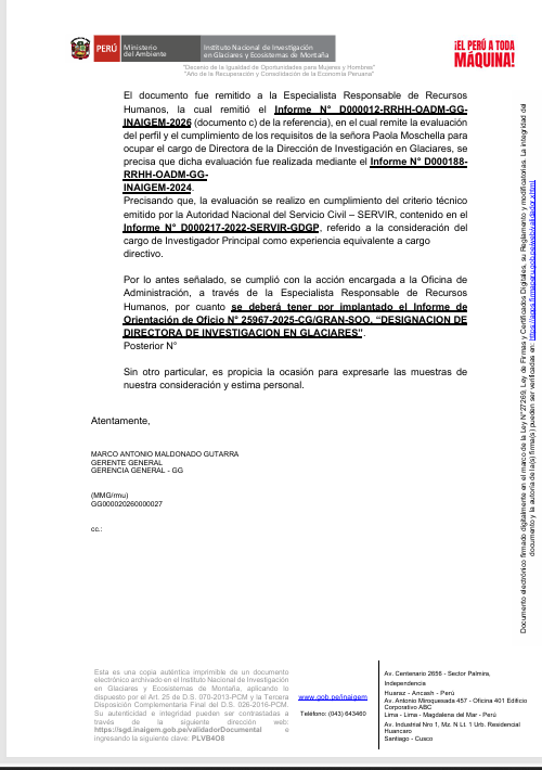 Posteriormente, mediante el Oficio N.° D000019-GG-INAIGEM-2026, la Gerencia General del INAIGEM informó que la designación fue evaluada por el área de Recursos Humanos y sustentada en criterios técnicos de la Autoridad Nacional del Servicio Civil (SERVIR).