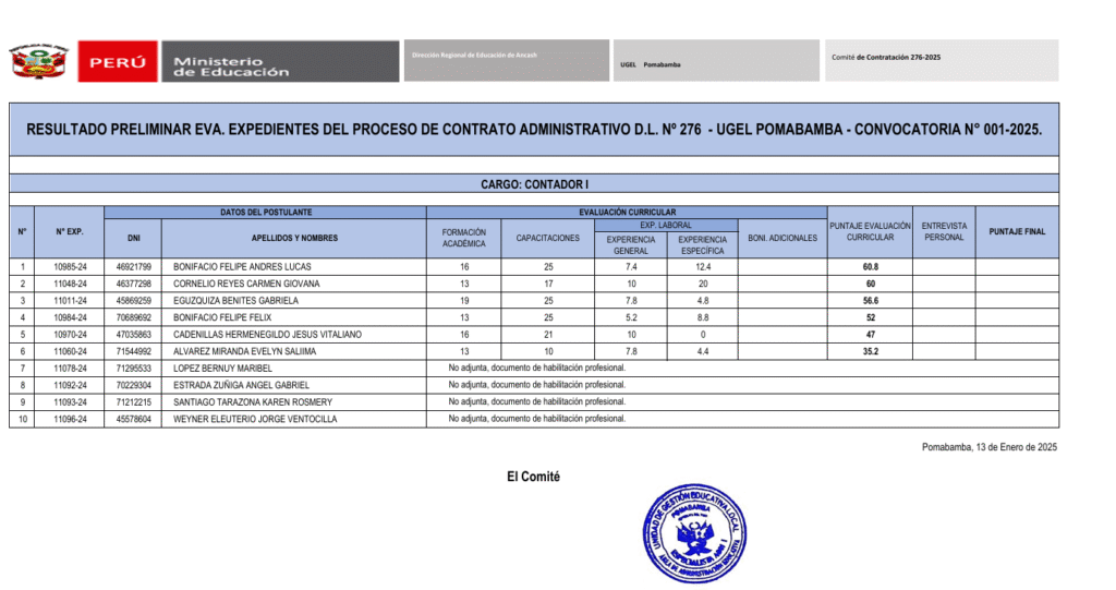 Pese a las solicitudes formales y denuncias verbales presentadas ante las instancias correspondientes, la UGEL Pomabamba continuaría con el proceso de contratación de un trabajador que no cumpliría con el perfil profesional exigido para el cargo de Contador I, según denunció un postulante del concurso CAS N.° 276.