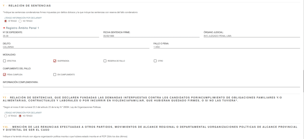 Su hoja de vida, registrada ante el JNE, consigna solo estudios primarios y secundarios concluidos, sin formación superior acreditada. Sin embargo, lo más relevante no está en lo académico, sino en el pasado judicial que arrastra: una sentencia penal firme por el delito de calumnia, emitida en 1988 por el Octavo Juzgado Penal de Lima, con un año de pena suspendida. Una condena cumplida, sí, pero que no desaparece del historial.